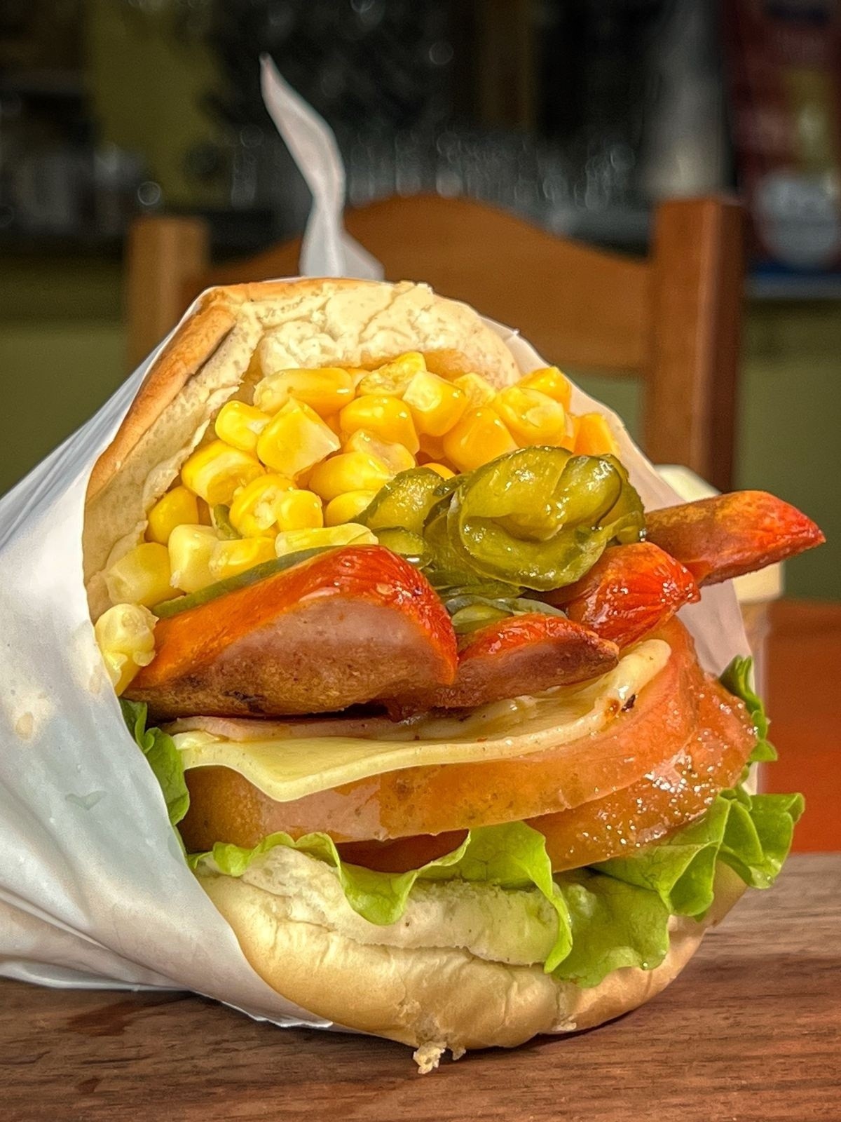 Pao, Salsicha, Presunto, Queijo, Alface, Tomate, Pepino, Vinagrete